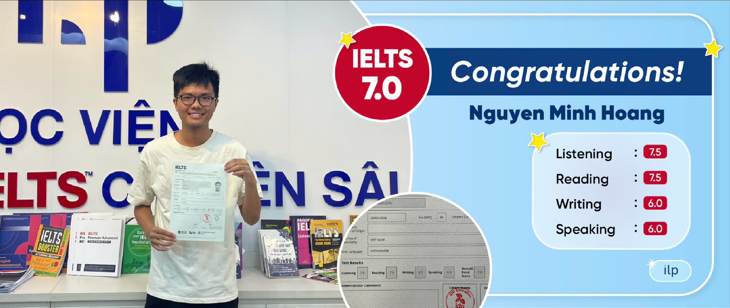 Chúc mừng Nguyễn Minh Hoàng, học sinh trường THPT Chuyên Trần Đại Nghĩa đã đạt IELTS 7.0 Overall và được tuyển thẳng vào Trường Đại học Bách khoa TP. Hồ Chí Minh.