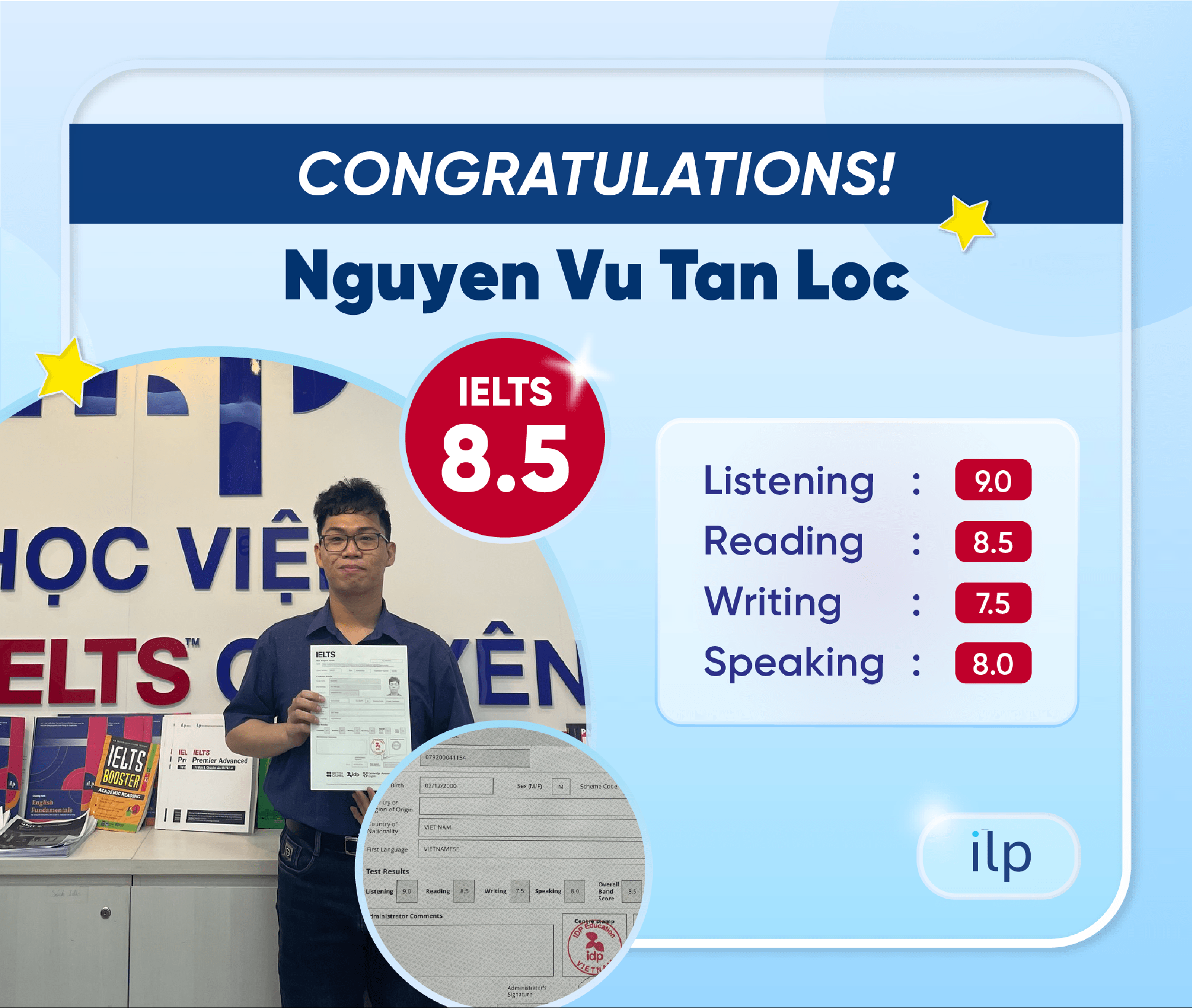 Chúc mừng bạn Nguyễn Vũ Tấn Lộc đã xuất sắc đạt 8.5 IELTS Overall.