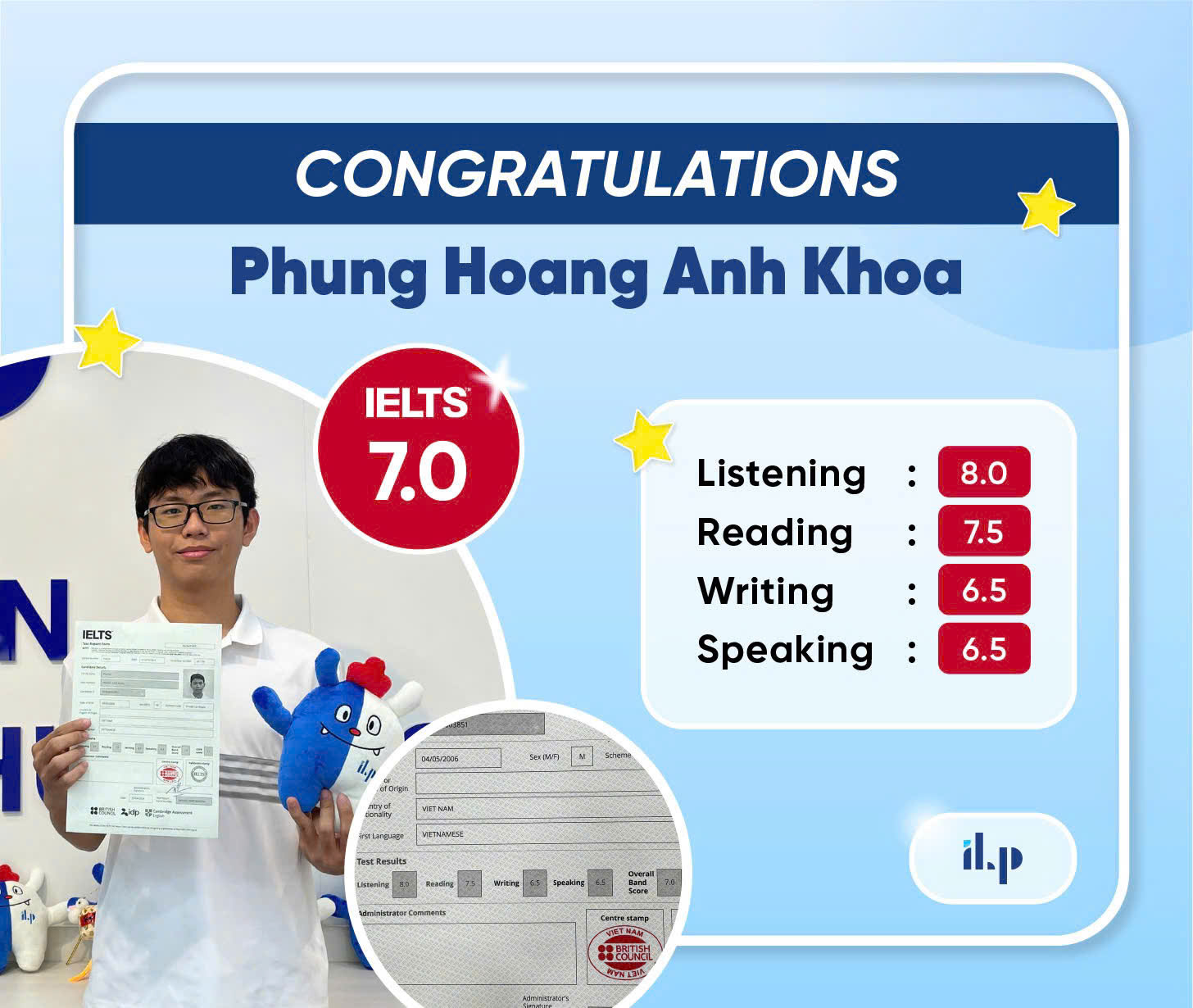 Chúc mừng Phùng Hoàng Anh Khoa, học sinh Trường THPT Nguyễn Thượng Hiền đã đạt điểm IELTS 7.0 Overall.