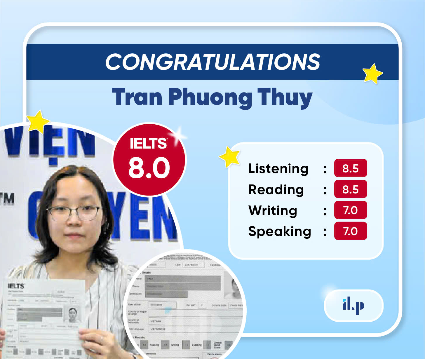 Chúc mừng bạn Trần Phương Thùy đã xuất sắc đạt IELTS 8.0 Overall.