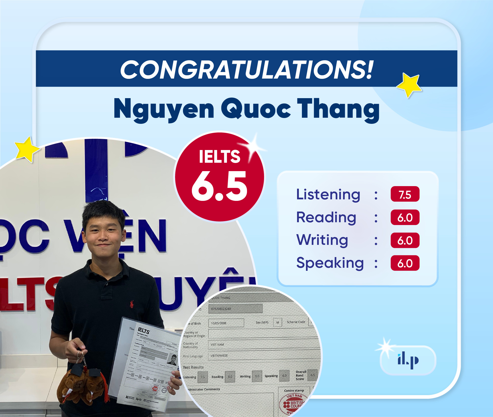 LỢI GIA BẢO ĐẠT ĐIỂM IELTS 6.5 OVERALL
