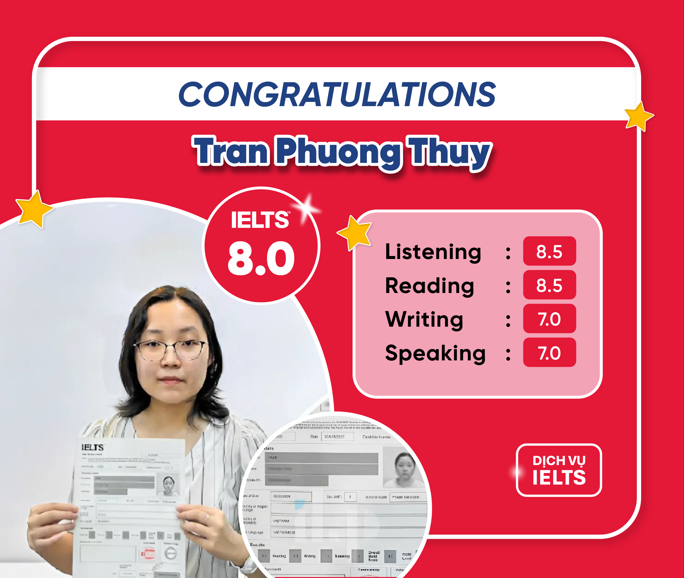 Chúc mừng bạn Trần Phương Thùy đã xuất sắc đạt IELTS 8.0 Overall.